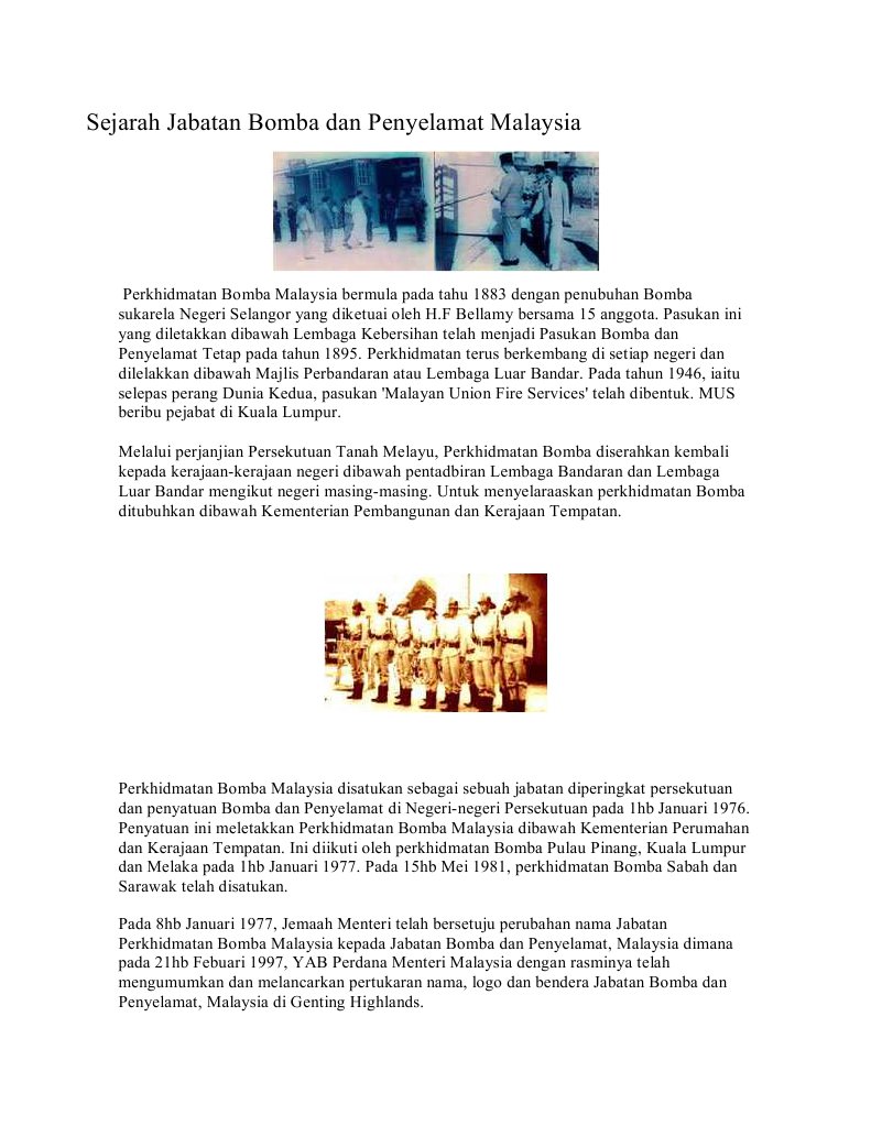 Kerajaan ingin merakamkan penghargaan kepada angkatan tentera malaysia polis diraja malaysia jabatan bomba dan penyelamat jabatan kastam diraja. Perkhidmatan Bomba Malaysia disatukan sebagai sebuah jabatan diperingkat persekutuan dengan penyatuan Bomba dan Penyelamat di Negeri-negeri Persekutuan pada 1hb januari 1976. 603-8892 7600 e-mel.