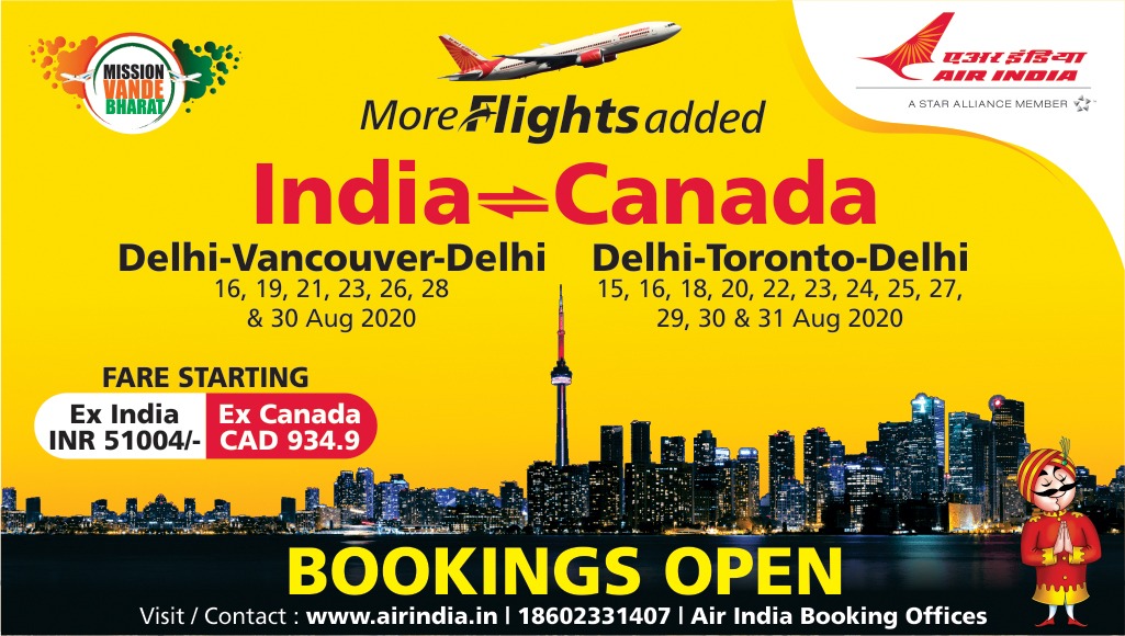 Cheap Flights from 1000s of Websites. Air India has announced 12 additional flight from August 18 to 30 to Canada and Vancouver from Delhi under the 5th phase of Vande Bharat Mission. Book Your Next Adventure.