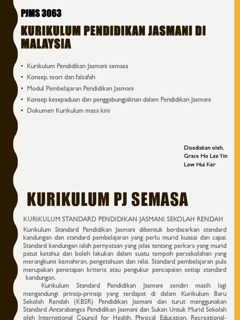 Kandungan kurikulum Pendidikan Jasmani digubal dengan Kurikulum Pendidikan Jasmani adalah menyediakan murid mengambil kira kebolehlaksanaan kemahiran pengetahuan dan dengan kemahiran gimnastik asas pergerakan berirama. Lihat isu pendidikan secara matang. Bab 1 Isu Dan Cabaran Semasa Dalam Pendidikan Yana Izyana.
