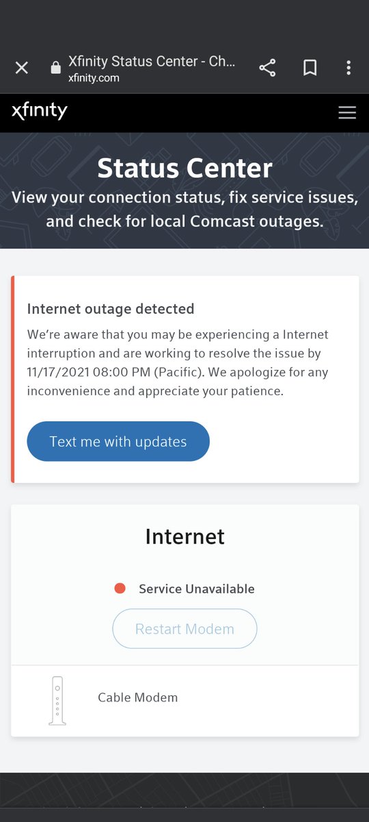 Xfinitys My Account on the Xfinity website Via the Comcast Outage Map Automatic updates via text message alerts. Xfinity has an outage like mf I have to study my test is mondai 沈. Alondra alondrapitones reported 3 months ago from Bolingbrook Illinois.