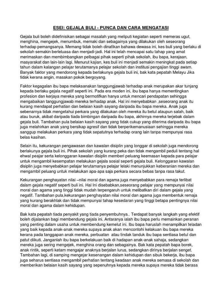 Karangan Esei Bahasa Malaysia BM STPM. Punca perdana yang mendorong aktiviti gejala samseng ini adalah ramai dalam kalangan pelajar kurang mendapat kasih sayang dan perhatian daripada ibu bapa. Walaupun peratusan yang terlibat masih berada dalam kedudukan yang rendah kes buli ini melibatkan tahap keselamatan murid di sekolah dan di luar sekolah.